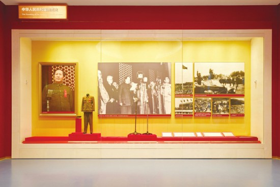 为了重点展示开国大典盛况,中国共产党历史展览馆特别设计了“开国大典”场景。步入展厅,正前方巨大的屏幕播放着珍贵的《中华人民共和国中央人民政府成立典礼原始影像》。这部12分钟的影像档案,是2019年中央档案馆以俄罗斯联邦档案部门提供的彩色影片为基础剪辑制作而成,是目前公开的关于开国大典时间最长、内容最完整的视频,而在此之前国内保存的影像都只有黑白画面。展厅上方悬挂着按照天安门城楼当年样式复制的大红宫灯,左侧展示着毛泽东在开国大典时穿的呢衣、呢裤和使用的话筒等国家一级文物,右侧展示着毛泽东亲手按动电钮升起的中华人民共和国第一面五星红旗和中华人民共和国国徽、中华人民共和国国歌。
