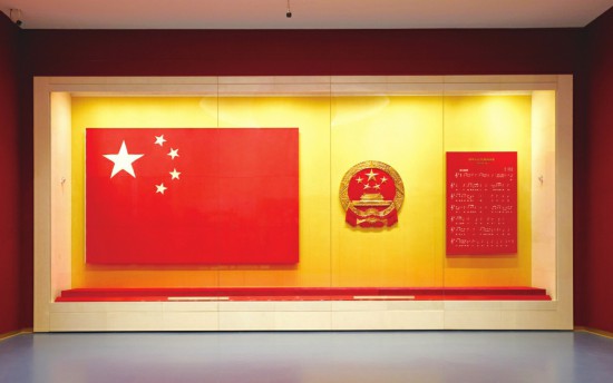 毛泽东亲手按动电钮升起的中华人民共和国第一面五星红旗和中华人民共和国国徽、中华人民共和国国歌
