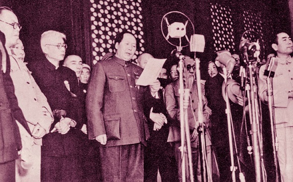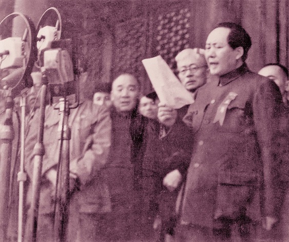 1949年10月1日,毛泽东在天安门城楼上宣读中华人民共和国中央人民政府公告。拍摄者为童小鹏