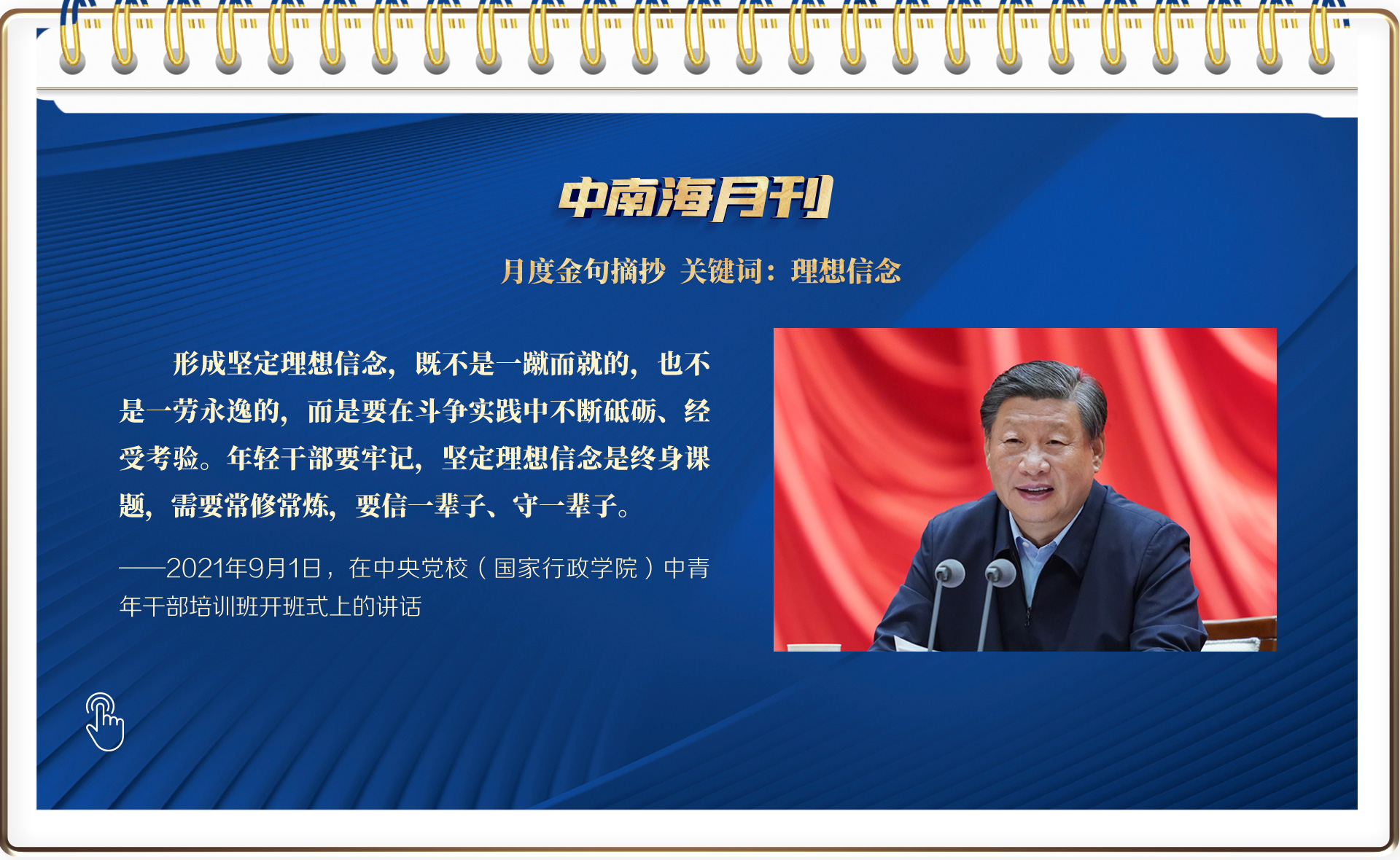 九月的第一天,总书记在2021年秋季学期中央党校(国家行政学院)中青年干部培训班开班式上,为中青年干部讲授重要一课。九月的最后一天,总书记在北京天安门广场出席烈士纪念日向人民英雄敬献花篮仪式,崇尚英雄、致敬英雄,以行动为我们再次上了生动一课。不忘本,才能开辟未来。