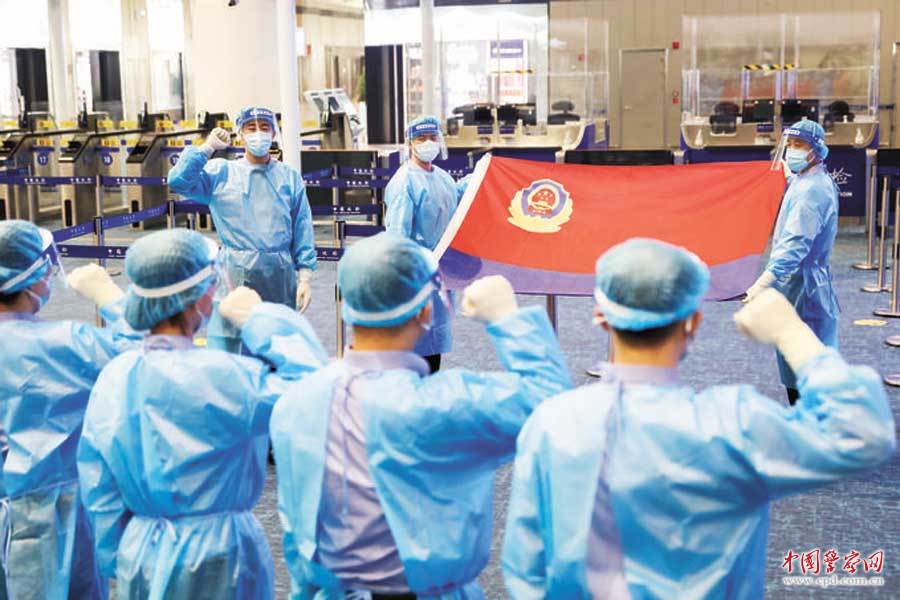1月7日,山东出入境边防检查总站青岛机场出入境边防检查站执勤二队民警面向警旗重温入警誓词。解豪 摄