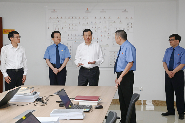 在海南省检察院,应勇听取海南检察机关服务保障海南自由贸易港建设、数字检察、高质效办案等工作汇报,对海南检察工作给予充分肯定。他强调,胸怀大局、了解大局才能更好融入大局、服务大局。海南检察机关要加强党的创新理论武装,学思践悟习近平法治思想,坚持党对检察工作的绝对领导,持续擦亮坚定拥护“两个确立”、坚决做到“两个维护”的鲜明政治底色。要全面准确学习贯彻二十届三中全会精神,把党中央决策部署、最高检工作要求与海南工作实际紧密结合起来,坚持从政治上着眼、从法治上着力,充分运用法治力量服务进一步全面深化改革,确保检察政策、检察工作、检察举措与党和国家宏观政策取向一致。要深入贯彻海南自由贸易港法,贯彻总体国家安全观,认真落实最高检《关于充分履行检察职能服务保障海南自由贸易港建设的意见》,统筹发展和安全,切实维护国家政治安全和社会大局稳定,为海南自贸港建设营造良好法治环境。深入领会落实习近平总书记关于海南坚持生态立省不动摇的重要指示精神,充分发挥生态环境公益诉讼等检察职能,守护好海南的蓝天、净土、碧海。检察机关的主责主业是法律监督,履行职责的基本方式是办案。要坚持法律监督宪法定位,努力做到“三个善于”,深化研究运用“三个结构比”,朝着全面协调充分发展的方向,巩固深化“四大检察”基本格局。作为保障国家法律统一正确实施的司法机关,检察机关要严格做到依照法律规定和“三定”履职。检察履职严格依法才是好,实事求是才是好,遵循规律才是好。要从最高检、省级检察院做起,坚决防治形式主义,纠正不同程度存在的唯数据、唯指标问题,调整、改变简单以数据进行考核管理的思维模式和工作方式,取消一切不必要、不适当、不合理的考核,真正为基层减负,让检察工作进一步回归到高质效办案这个本职、本源上来,让广大检察官真正把精力放到高质效办好每一个案件上,放在高质效办好每一个案件的每一个环节上,确保严格依法办案、公正司法。要进一步加强检察权制约监督机制建设,健全司法责任认定和追究机制,实质性开展检察官惩戒工作,促进落实和完善司法责任制。持之以恒推进全面从严治检,常态化开展纪律教育,不断提升检察人员政治素养、业务素能和职业道德素质,着力锻造堪当重任、忠诚干净担当的检察铁军。