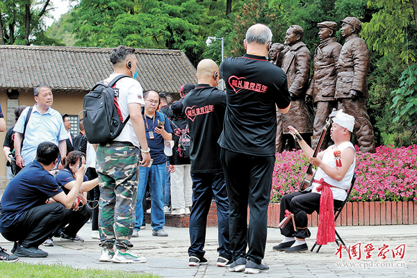 来源: 中国警察网 “南湖精神到宝塔,长征胜利落脚点,革命希望寄延安……” 6月17日,头绑白毛巾的艺人刘元龙手上弹着三弦,腿上绑着快板,用浓厚陕北话,唱着自己编写的陕北说书《为人民服务》。刘元龙所在的位置是1944年9月8日中央机关为张思德召开追悼会的枣园。毛泽东主席就是在这次追悼会上发表了著名的《为人民服务》演讲。