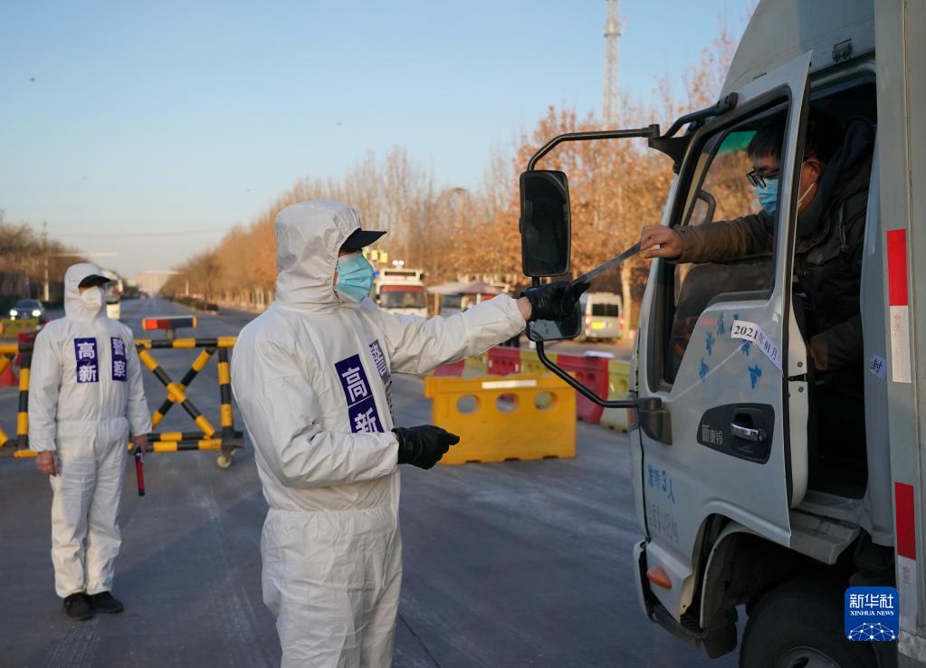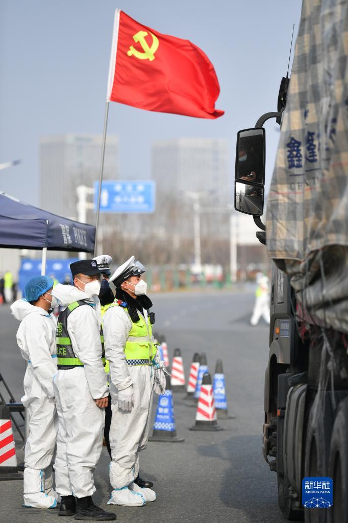 石家庄市公安局高新技术产业开发区公安分局民警在藁城区通往市区的路口执勤(2021年1月10日摄)。当日是首个“中国人民警察节”。新华社记者杨世尧摄