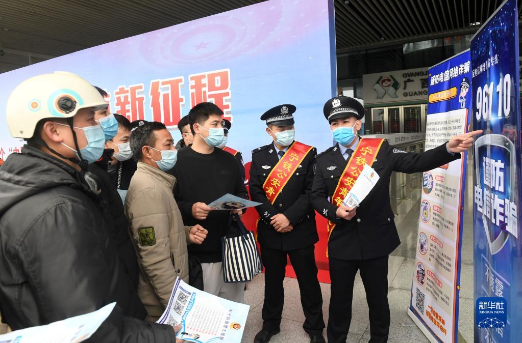 在广西南宁东站,南宁铁路公安处民警向旅客宣传防电信诈骗常识(2022年1月9日摄)。新华社记者陆波岸摄