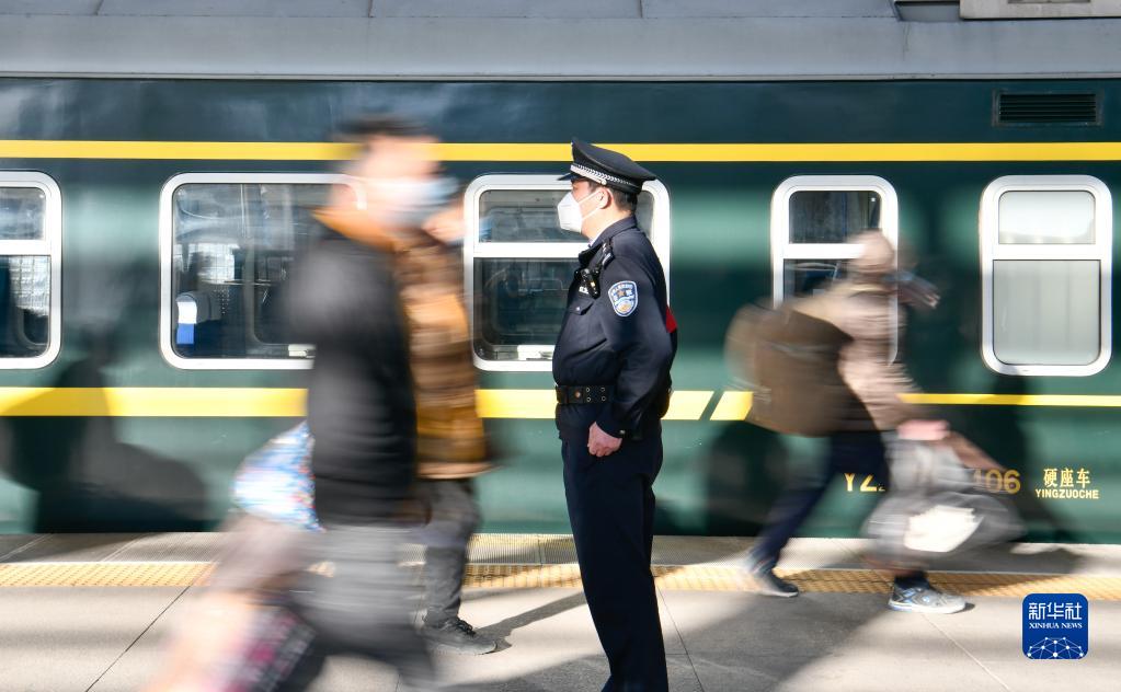 北京铁路公安局天津铁路公安处乘警支队四大队民警高天顺在天津站执勤(2021年2月3日摄)。新华社记者孙凡越摄