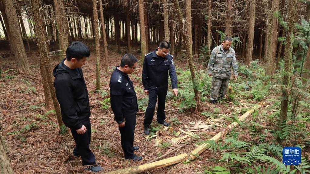 福建省南平市浦城县公安局石陂森林派出所所长郭晓强(右二)在盗伐林木案件现场分析作案动机(2020年12月11日摄)。新华社记者赵雪彤摄