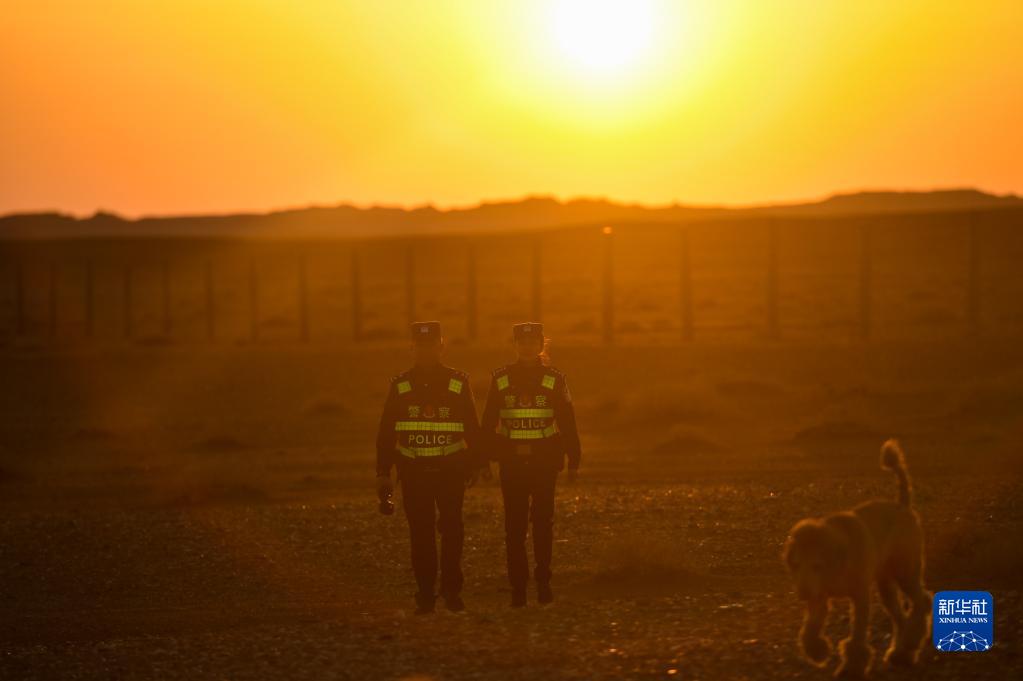 内蒙古阿拉善边境管理支队银根边境派出所戍边夫妻警务室的徐乃超和李文娜在边境线附近巡逻(2022年4月18日摄)。新华社记者彭源摄