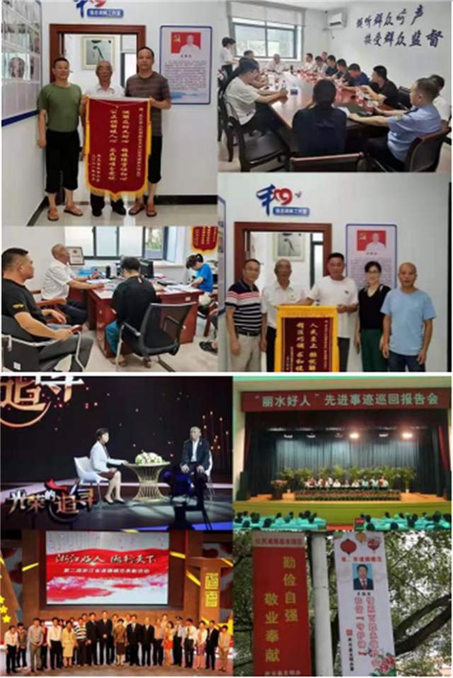 ③庆元县委副书记李见阳等送鲜花慰问吴强忠。④群众竖起大拇指为吴强忠点赞扬。