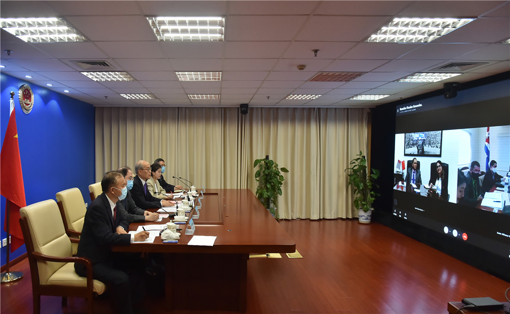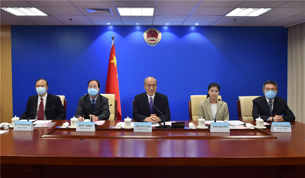 最高人民检察院检察长张军在京与古巴总检察长雅米拉·培尼亚·奥赫达进行视频会晤。