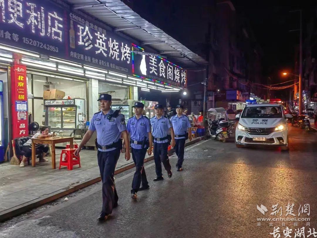 7月1日晚,在孝感市“小吃一条街”玉泉南路,一辆警车停在街头闪着警灯,3名公安民警辅警正在徒步巡逻。