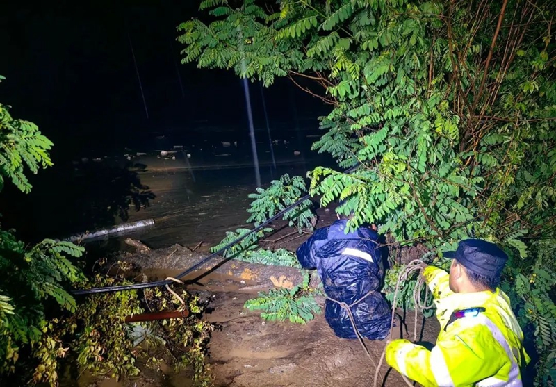 情况紧急,民警做好防护准备后跳入泥泞急湍的河水,利用救生绳救出受困群众,并第一时间送往医院就医。