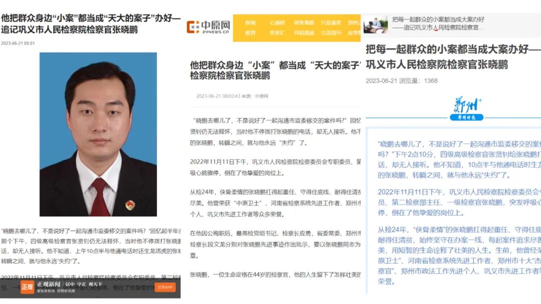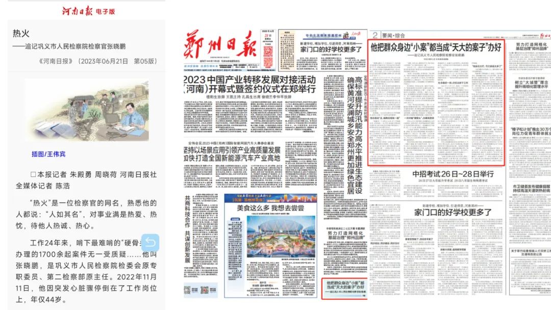 2023年6月21日,《河南日报》5版刊发《热火——追记巩义市人民检察院检察官张晓鹏》,《郑州日报》2版头条、《郑州晚报》6版、7版两个版面、郑州广播电视台、正观新闻、中原网等多家媒体分别报道了张晓鹏的事迹,在社会上引起了广泛关注。