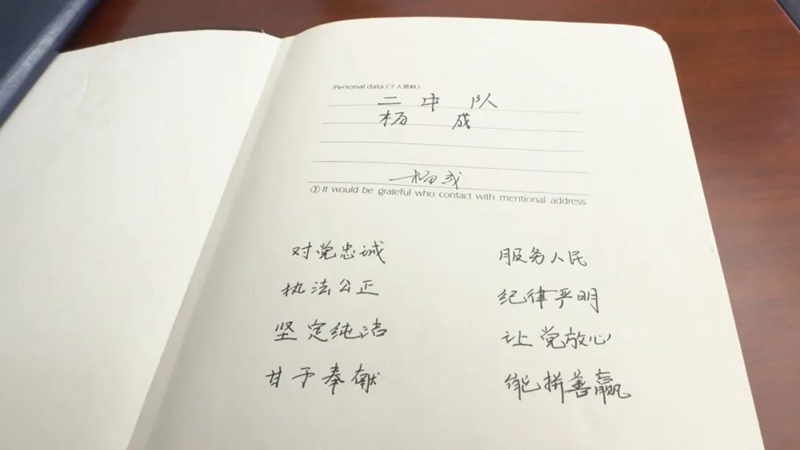 扎根交管一线19年,“对党忠诚、服务人民、执法公正、纪律严明”的“四句话,十六字”总要求,被杨成工整地写在工作笔记本首页。他是这样记的,也是这样做的。