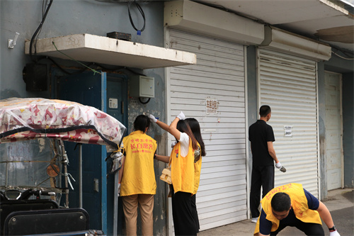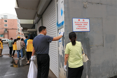 活动中,各位党员自行分组,对影响环境卫生的“牛皮癣”进行了地毯式清理。大家带好铲子、钢丝球、抹布、水桶、喷壶、垃圾袋等工具积极参与到清理行动中,将卷帘门、电线杆、酒店墙体上张贴和喷绘的小广告用铲子、抹布反复清理,个别小广告被胶水牢牢地粘在墙面上,极难清理,但大家都不厌其烦地用水冲洗、用刮刀、铲子反复刮除磨洗,不给小广告留下一丝生存的空间。经过大家共同努力,一大批小广告被彻底清理,街道也恢复了干净整洁的面貌。