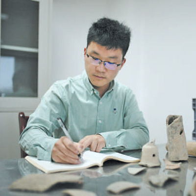 许丹阳在整理记录出土陶器。 |
