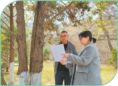 巨舜庆(左)在向工作人员了解树木长势和养护情况。 |