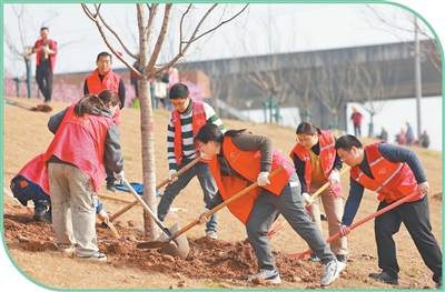 园林志愿者在湖北宜昌市伍家岗区柏临河畔栽种樱花树树苗。 |