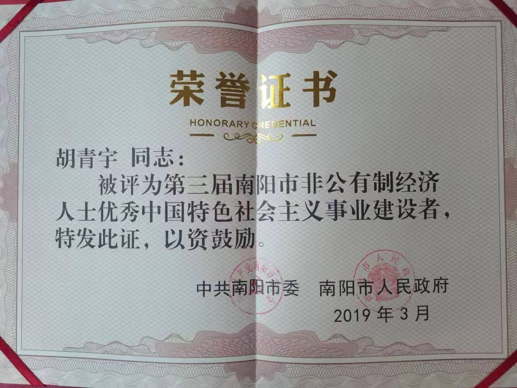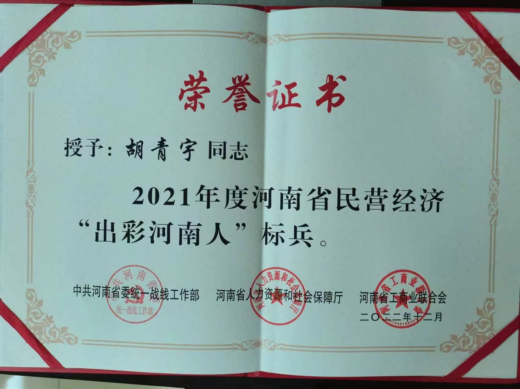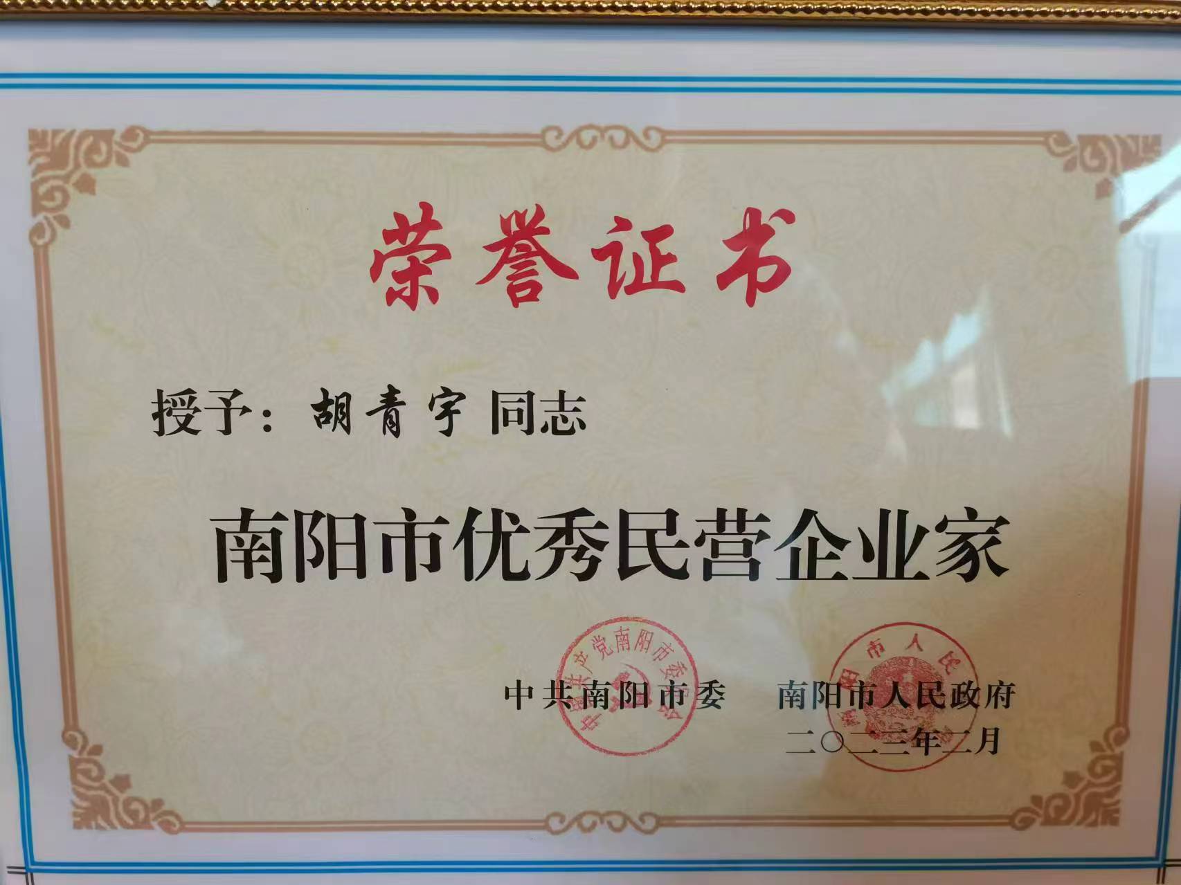 创新驱动增实力,厚积薄发铸辉煌。艰苦的努力换来辉煌的成绩:南阳环宇电器有限公司先后荣获“南阳市一星级工业企业”、南阳市“劳动关系和谐企业”、宛城区“科技创新示范企业”、宛城区“统战工作先进单位”。公司董事长胡青宇先后荣获“河南省千企帮千村精准扶贫行动先进个人”、“出彩河南人‘标兵’”、“南阳市劳动模范”、“第三届南阳市非公有制经济人士优秀中国特色社会主义事业建设者”、“南阳市第三届返创之星”、“宛城区十大杰出企业家”、“宛城区五四奖章”、“宛城区拔尖人才”等称号并当选为市区两级人大代表、河南省工商联第十三次代表大会代表、执委。(南阳广电记者:王丽)