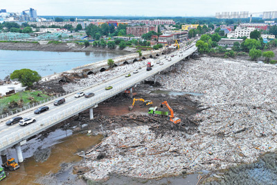 8月7日,北京市房山区琉璃河桥,大型机械在清理水面漂浮物,疏通河道。 |