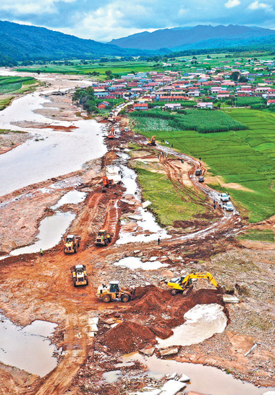 8月6日,在通往吉林省舒兰市青松林场的村道上,大型机械在抢修水毁道路。 |