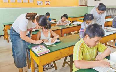 8月8日,河北省献县乐寿镇东翟小学安置点内,学校老师为学生辅导功课。 |