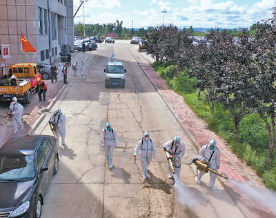 8月8日,黑龙江省尚志市,工作人员对洪水过后的道路进行消毒。 |