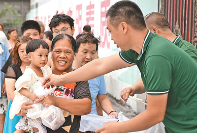 8月6日,河北省涿州市码头镇向五村,天津市阿米玛玛何庄子农产品批发市场工作人员为受灾群众免费提供盒饭。 |