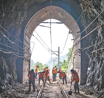 8月7日,北京市门头沟区王平镇,中国铁路北京局北京西工务段工作人员在清理路基和轨道。 |