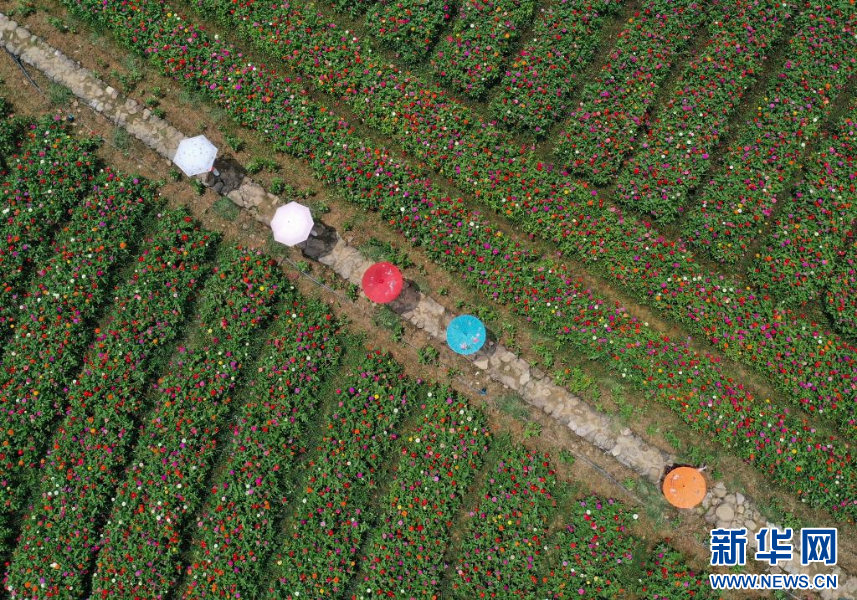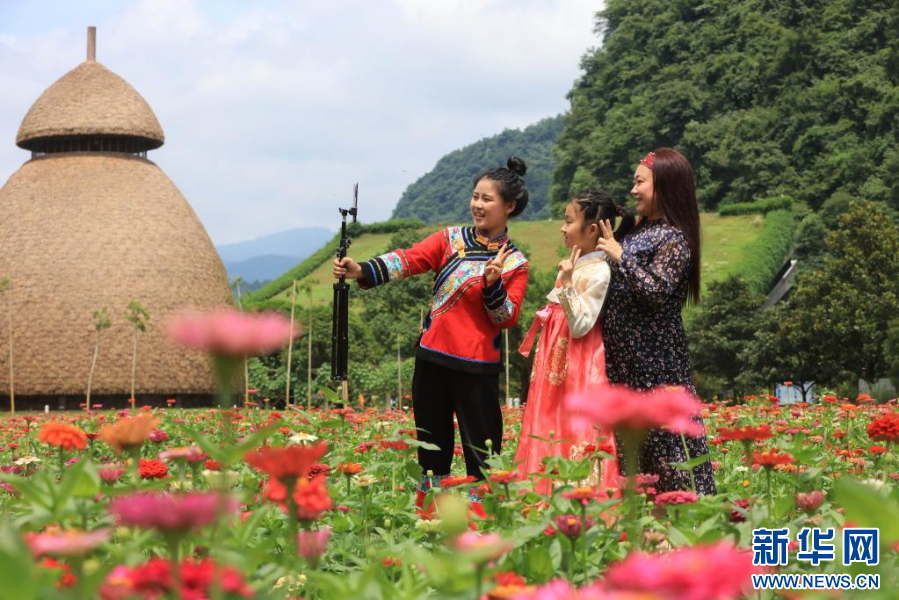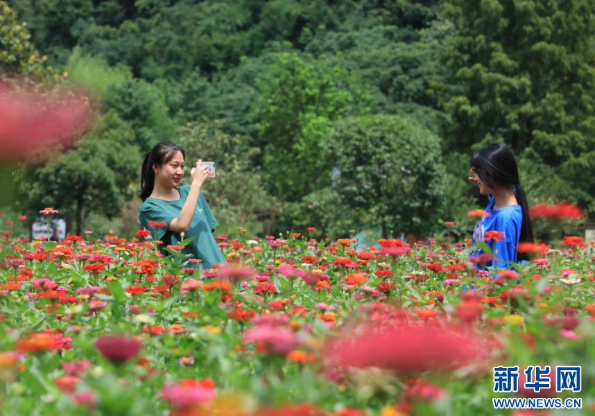 7月4日,游人在张家界市武陵源区黄龙洞景区生态田园广场的花海中赏花游玩。夏日的湖南张家界市武陵源区黄龙洞景区,成片的百日菊形成色彩斑斓的花海,花香四溢,吸引游客前来赏花游玩。