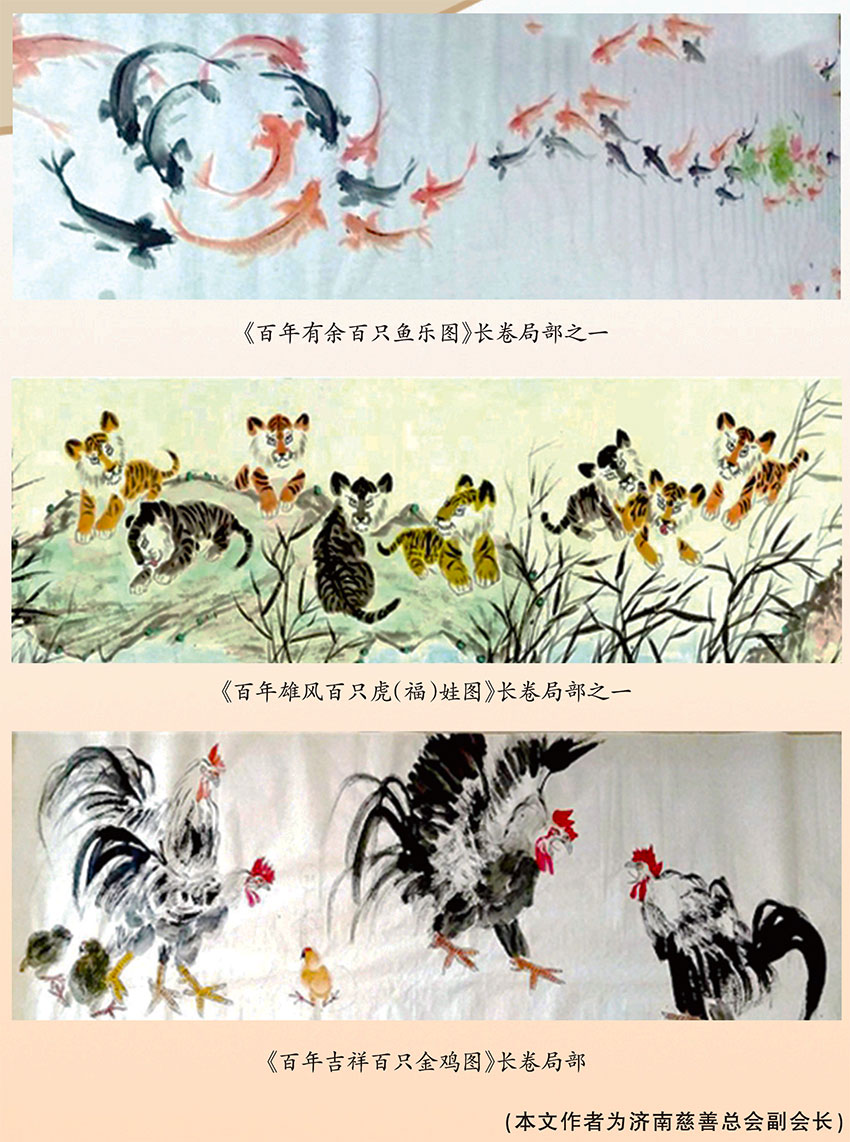 慈善公益报 为迎接建党100周年,中国慈善艺术大家、“军中虎王”卢道印历经十余年精心酝酿,创作出了《百年富贵百朵牡丹图》《百年吉祥百只金鸡图》《百年福禄百只葫芦图》《百年平安百只竹林图》《百年有余百只鱼乐图》《百年如意百只金柿图》《百年雄风百只虎(福)娃图》《百年辉煌山水画卷》《百年红色传人百位童趣图》“九个一百”中国画艺术长卷,意为中国共产党带领全国人民砥砺奋进,不怕牺牲,敢于拼搏,创造了百年辉煌,使人们过上了富贵吉祥、福禄平安、事事如意、年年有余的幸福生活,并以此歌颂党的百年伟业,祝福伟大的祖国更加繁荣富强,鼓励人们为实现伟大复兴的中国梦而努力奋斗。