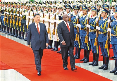 会谈前,习近平在人民大会堂北大厅为拉马福萨举行欢迎仪式。