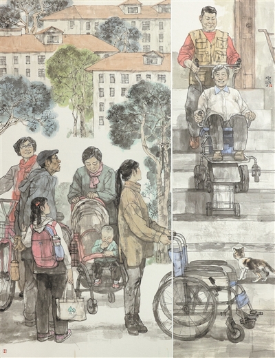 国家实施城镇保障性安居工程帮助许多群众改善了住房条件。陈树中油画《俱欢颜·安居》,以细腻的笔触,定格人们搬新家的场景,体现保障性安居工程带来的民生新变化。作者有意以人物为主体,使其成为视觉中心,并通过细致的神态刻画和心理描绘,展现他们发自肺腑的喜悦。人群后方楼房林立,绿树成荫,寓指人们将在新家中开启美好新生活。城市更新不断刷新居民的幸福指数,尤其是“适老化”设计,助力老旧小区综合改造。周圆中国画《美丽家园,幸福生活》,便抓住了“爬楼机”这一关键词,以小见大,体现城市的温度。作品以两联画的形式,分别刻画了社区改造后焕然一新的面貌,以及楼宇内腿脚不便的老人尝试使用爬楼机的场景,生活气息浓郁。这既是安居梦的艺术缩影,也是作者关注现实的真切表达。