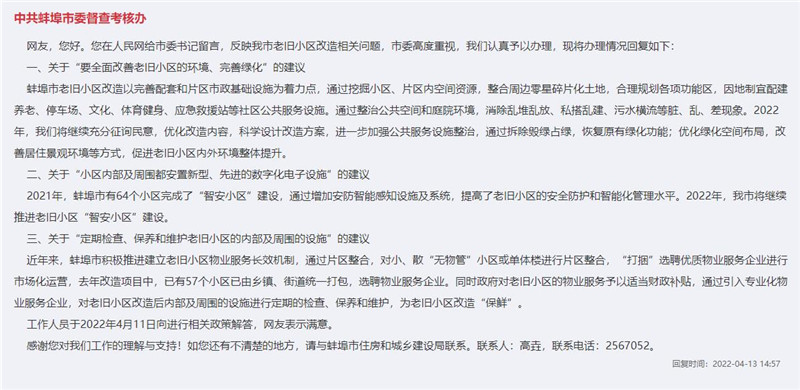 蚌埠市相关部门回复。人民网“领导留言板”截图