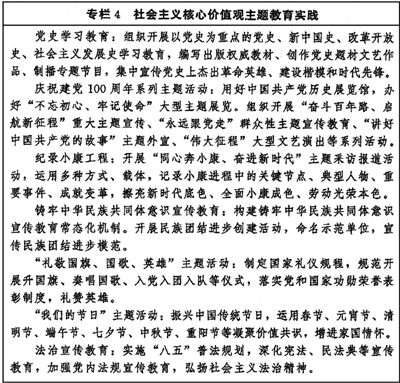 持续深化社会主义核心价值观宣传教育,增进认知认同、树立鲜明导向、强化示范带动。坚持贯穿结合融入、落细落小落实,把社会主义核心价值观要求融入日常生活,融入法治建设。推动理想信念教育常态化制度化,筑牢党员干部、青少年等重点群体的理想信念之基。围绕“七一”、“八一”、“十一”等重大时间节点,依托革命历史类纪念设施、遗址和爱国主义教育基地等载体,加强爱国主义、集体主义、社会主义教育,弘扬党和人民在各个历史时期奋斗中形成的伟大精神。加强公益广告宣传。统筹开展诚信教育、勤俭节约教育、劳动创造幸福主题宣传教育。强化祖国统一和民族团结进步宣传教育,深化“一国两制”实践教育,强化全民国防教育,促进平安中国建设。(见专栏4)