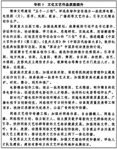 鼓励文化单位和广大网民依托网络平台依法进行文化创作表达,推出更多优秀的网络文学、综艺、影视、动漫、音乐、体育、游戏产品和数字出版产品、服务,推出更多高品质的短视频、网络剧、网络纪录片等网络视听节目,发展积极健康的网络文化。实施网络精品出版、网络音乐产业扶持计划。加强各类网络文化创作生产平台建设,鼓励对网络原创作品进行多层次开发,引导和规范网络直播等健康发展。加强和创新网络文艺评论,推动文艺评奖向网络文艺创作延伸。(见专栏9)