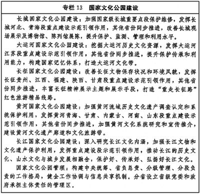整合长城、大运河、长征、黄河、长江沿线等重要文化资源,强化文物和非遗真实完整保护传承,重点建设管控保护、主题展示、文旅融合、传统利用等主体功能区,系统推进保护传承、研究发掘、环境配套、文旅融合、数字再现等重点基础工程,实施公园化管理运营,形成具有特定开放空间的公共文化载体,集中打造中华文化重要标志。(见专栏13)
