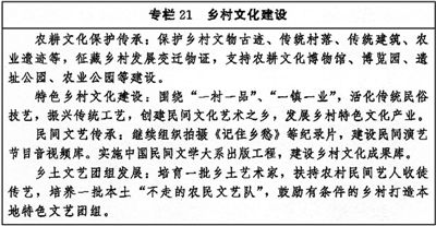 充分发挥文化传承功能,全面推进乡村文化振兴,推动乡村成为文明和谐、物心俱丰、美丽宜居的空间。加强农耕文化保护传承,支持建设村史馆,修编村史、村志,开展村情教育。把乡土特色文化融入乡村建设,留住乡情乡愁。创新支持和激励方式,将优秀文化资源转化为乡村永续发展的优质资产,推动乡村文化建设与经济社会发展良性互促。探索以志愿服务等方式,发展民间优秀文化机构、文艺团体。鼓励乡村自办文化,支持农民办自己的文化艺术节、诗歌故事会、剧团演出、书画摄影创作展等。增加乡村优秀文化产品与服务供给,推进文化结对帮扶,鼓励“三农”题材文艺创作生产,扶持具有乡土特色的文艺创作。开展“互联网+中华文明”行动计划,推进数字文化资源进乡村。探索建立乡村文化交流交易平台,活跃乡村文化市场。(见专栏21)
