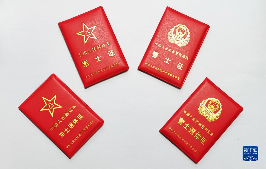 图为《中国人民解放军军士证》《中国人民解放军军士退休证》《中国人民武装警察部队警士证》《中国人民武装警察部队警士退休证》证件封皮。新华社发
