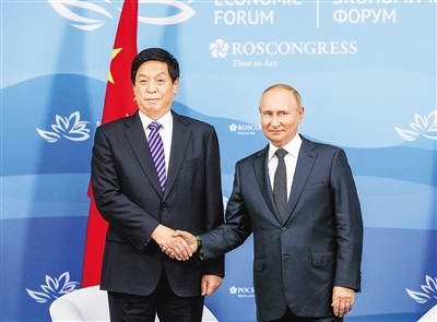 会见普京时,栗战书首先转达习近平主席的亲切问候和良好祝愿。栗战书说,在习近平主席和普京总统的战略引领和亲自推动下,中俄新时代全面战略协作伙伴关系始终保持强劲发展势头。两国政治互信、战略协作、务实合作都达到了新高度,成为大国、邻国睦邻友好、合作共赢的典范。中俄都处在发展振兴的关键历史阶段,合作潜力巨大、前景广阔。中方愿继续同俄方一道,在涉及彼此核心利益和重大关切问题上相互坚定支持,践行习近平主席提出的全球发展倡议和全球安全倡议,把高水平政治互信转化为更多务实合作成果。坚信在习近平主席和普京总统的领导下,新时代中俄关系将不断迈上新台阶,中俄两国一定能够沿着符合本国国情的发展道路走下去,实现各自国家发展、民族复兴的伟大目标。栗战书祝贺俄方成功举办第七届东方经济论坛,介绍了即将召开的中共二十大有关情况。