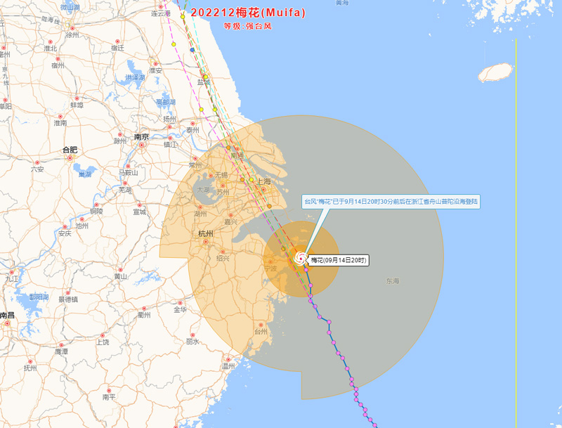 人民网杭州9月14日电 (孙鹏)据中央气象台消息,今年第12号台风“梅花”的中心9月14日晚上20时30分前后在浙江省舟山普陀沿海登陆,登陆时中心附近最大风力有14级(42米/秒,强台风级)。