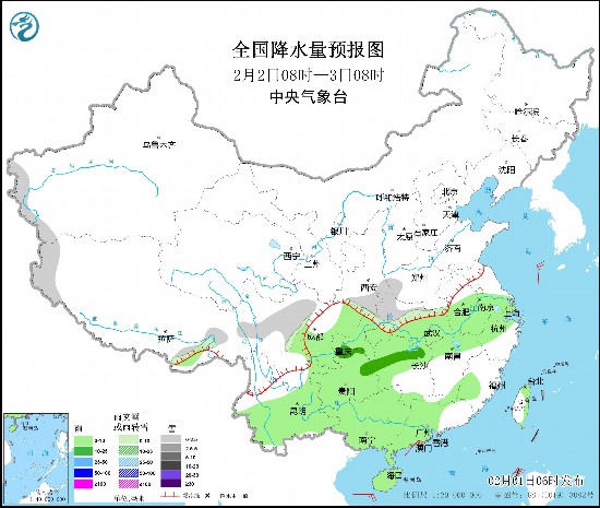 全国降水量预报图(2月2日08时-3日08时)。图片来源:中央气象台网站