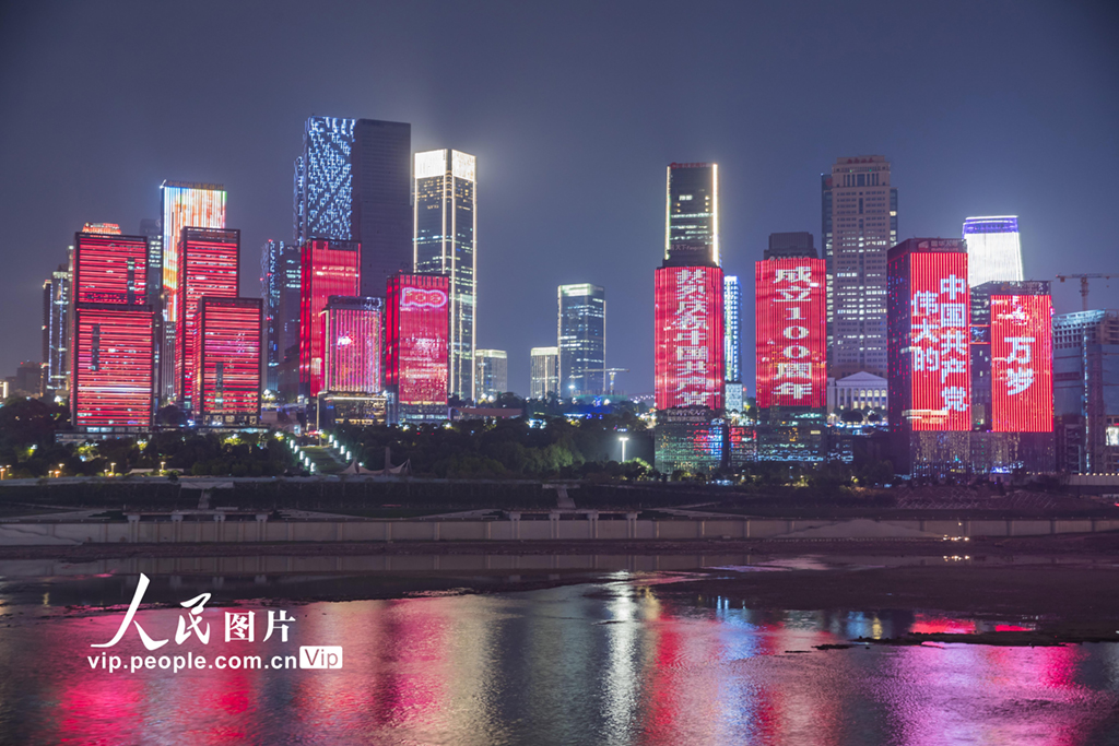 2021年6月22日晚,重庆庆祝建党100周年灯光秀精彩上演。当日,重庆两江四岸、各个区县,同时亮起璀璨灯光秀,用山水之城最美灯光秀庆祝建党100周年。孙凯芳摄(人民图片网)