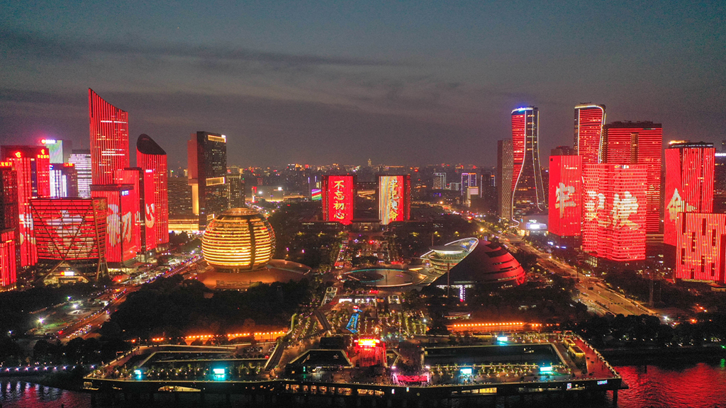 6月24日晚,杭州钱塘江畔上演庆祝建党100周年主题灯光秀。董旭明摄(人民视觉)