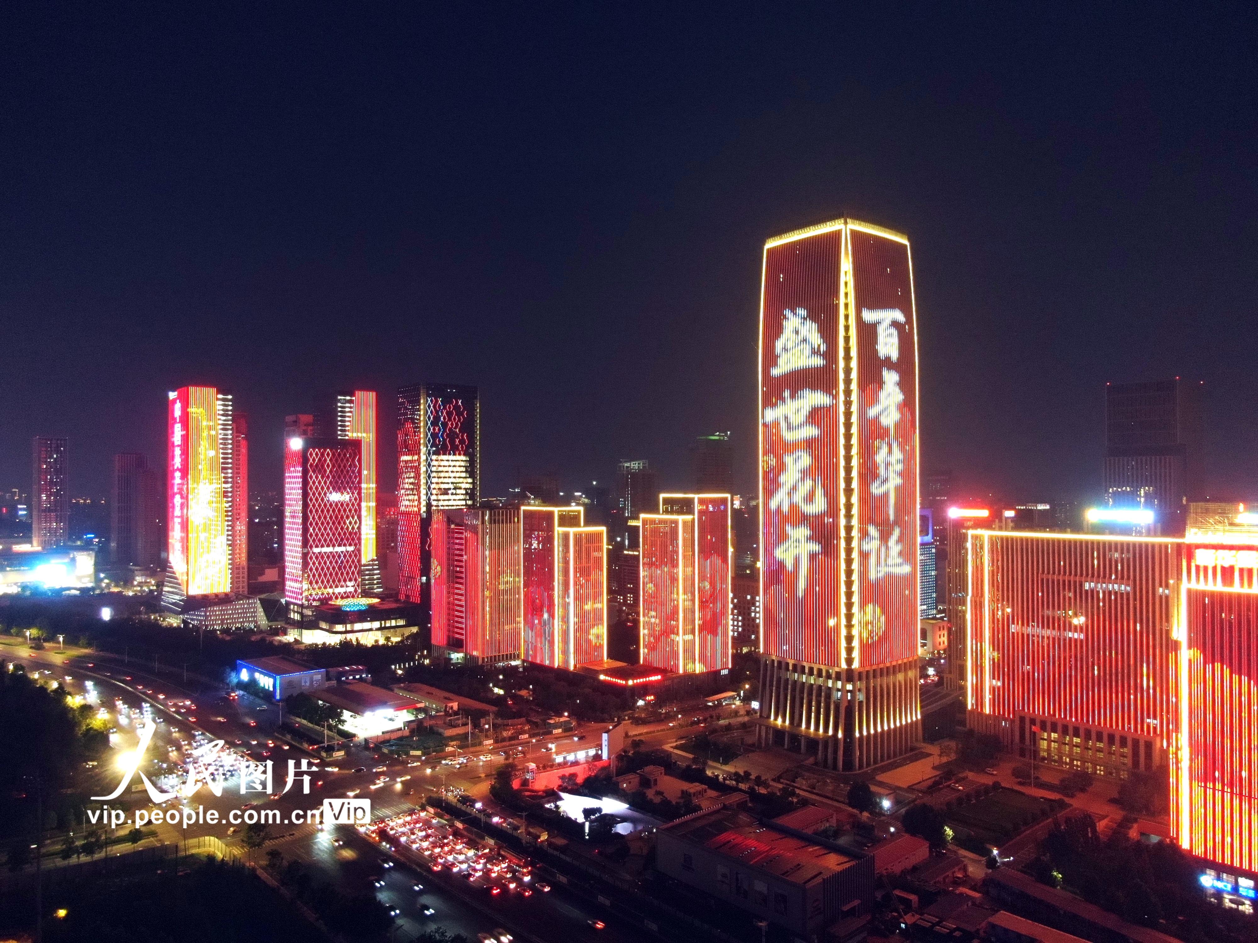 6月24日晚,山东济南60余栋楼宇点亮夜空,上演庆祝建党100周年主题灯光秀。徐舟摄(人民图片网)