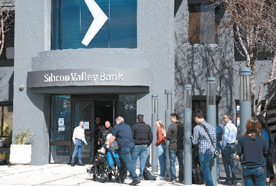 三月十三日,客户在美国加利福尼亚州圣克拉拉市硅谷银行总部外排队等候办理业务。 |