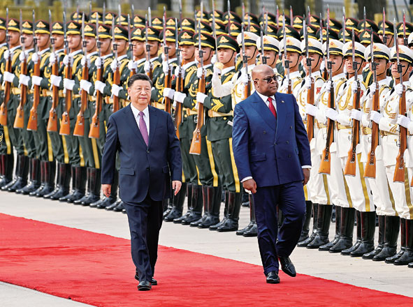 ▲5月26日下午,国家主席习近平在北京人民大会堂同来华进行国事访问的刚果(金)总统齐塞克迪举行会谈。这是会谈前,习近平在人民大会堂东门外广场为齐塞克迪举行欢迎仪式。新华社记者殷博古摄