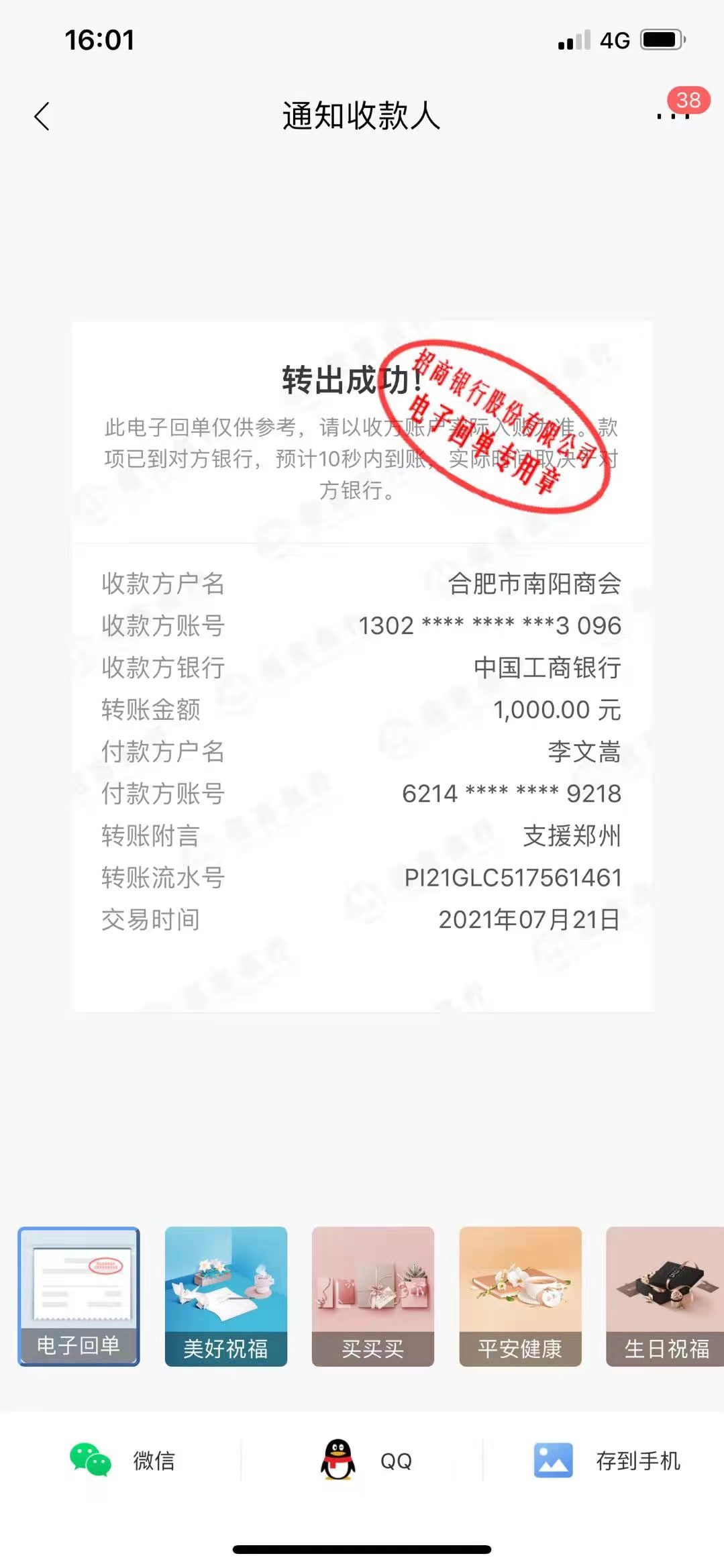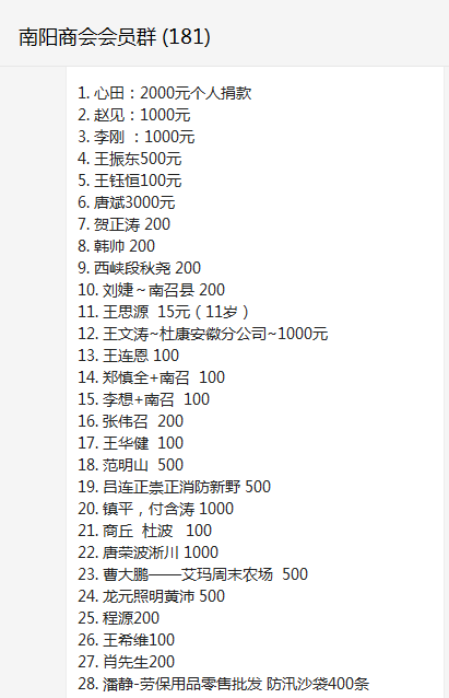 该倡议书在南阳商会群发出后,令人振奋的一幕在群内涌现出一位位爱心企业和相关人士,大家慷慨解囊向郑州灾情进行募捐,一张张汇款单在群内出现500、3000、10000--------在群内不断涌现而出。群内的接龙通知也不甘示弱,1、2、3、4-----26、27-------(个人捐款)不断的延续,每一次接龙都是一份爱,100、200、300、500、1000、2000------。