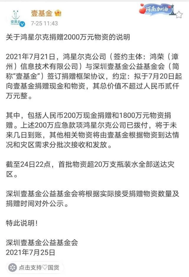7月25日凌晨,鸿星尔克通过官方微博发文称,公司通过郑州慈善总会捐赠的3000万物资、通过壹基金捐赠的2000万物资正在紧锣密鼓地运输及发放中。