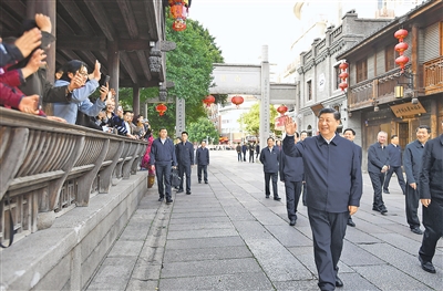 2021年3月22日至25日,中共中央总书记、国家主席、中央军委主席习近平在福建考察。这是24日下午,习近平在福州三坊七巷历史文化街区考察时,向游客和市民招手致意。 |